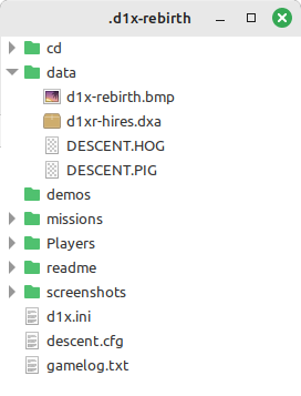 Nella directory utente (in Linux ~/.d1x-rebirth/) creiamo la sottodirectory DATA e copiamoci i due file indispensabili e il file d1xr-hires.dxa. Non mancherà l'icona del programma (d1x-rebirth.bmp).