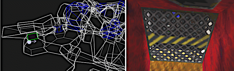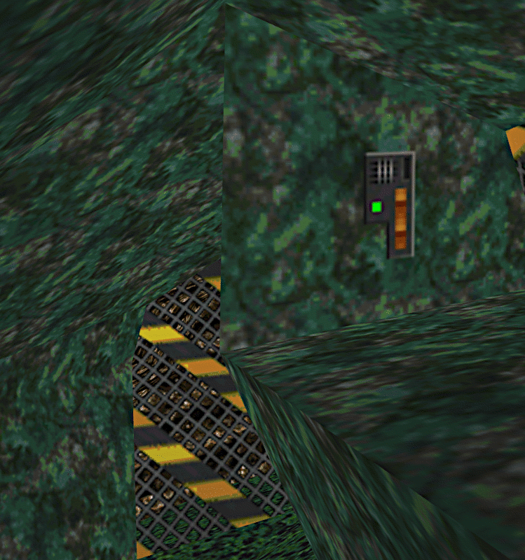 Quando siamo qui non perdiamoci lo strettissimo cunicolo che si intravede nella mappa (qui sopra a sinistra e figura seguente), contiene l'AmmoRack. La grata in fondo si affaccia sulla zona oltre la porta gialla. Questa grata sparirà quando azioneremo un certo interruttore dalle parti della chiave rossa, creando un collegamento tra la zona della chiave rossa e la zona iniziale.